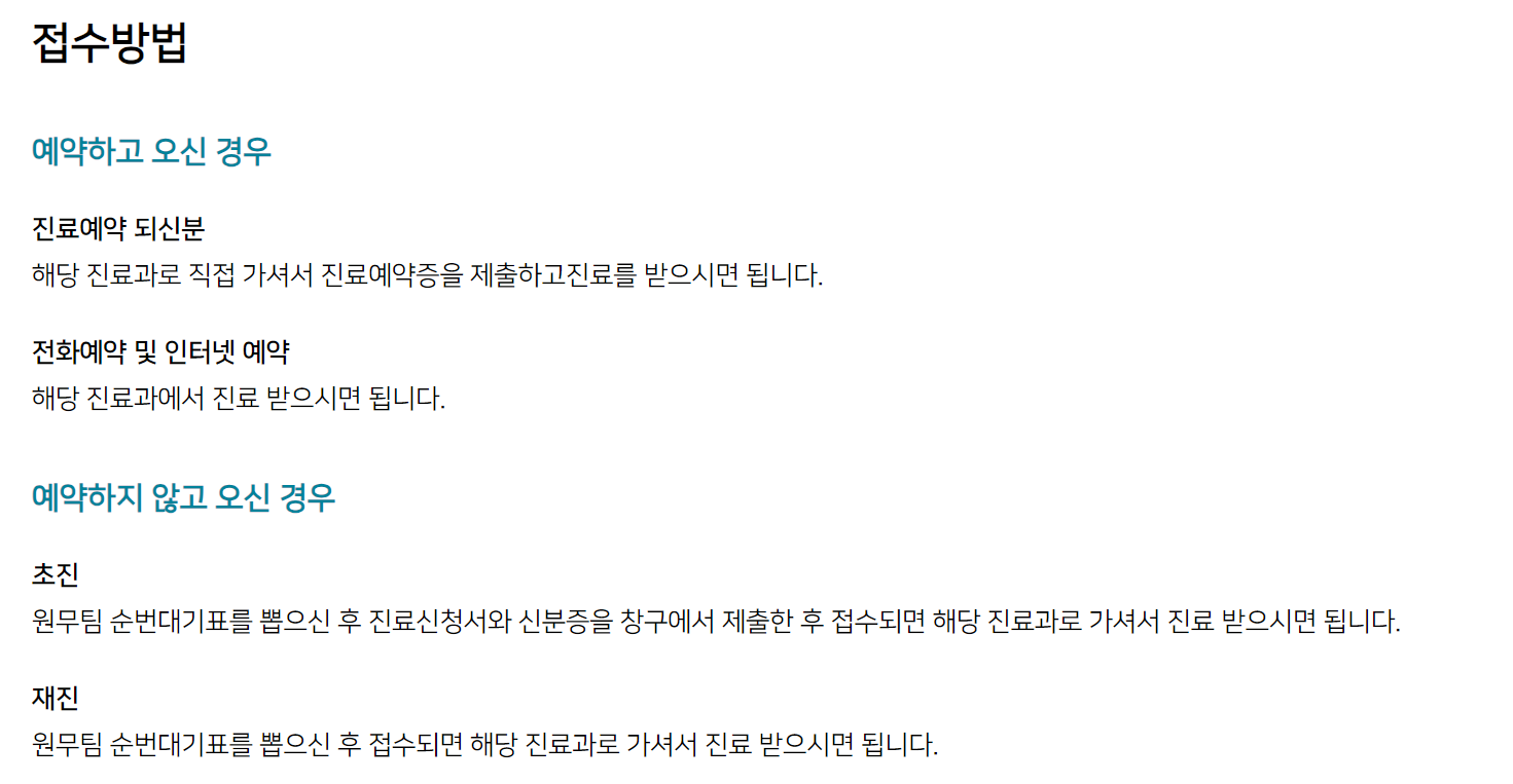 미리 예약하면 진료과에서 진료예약증만 제출하고 진료 받을 수 있습니다. 예약 안 하면 순번대기표 뽑고 기다려야 해요. 오래 걸리지 않으니 꼭 예약하고 받문하시길 바랍니다.