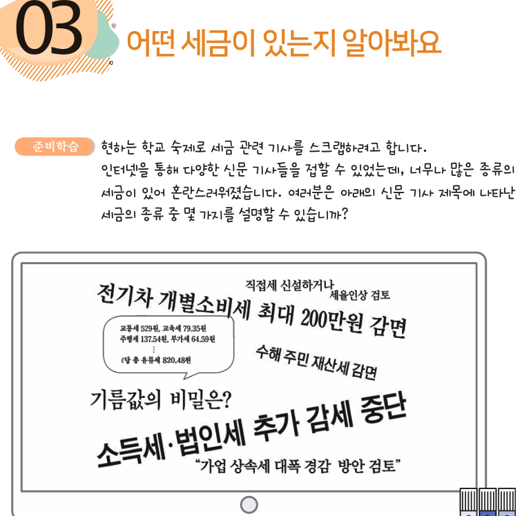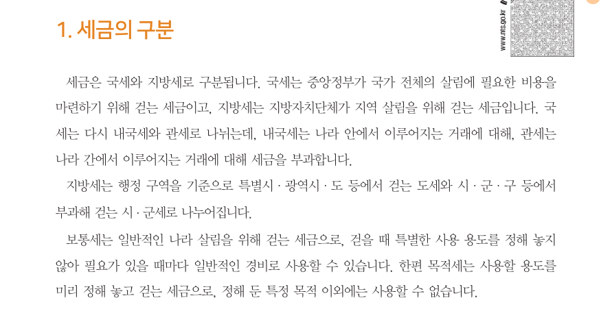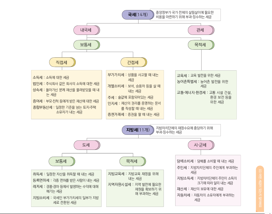 내용을 미리보기로 가져왔습니다. 세금의 종류가 어떻게 분류되는지에 관한 내용이네요. 학생들은 법인세, 지방세 등에 대한 용어가 생소할 수도 있겠어요.