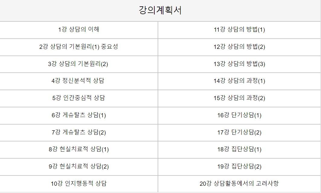 첫 강좌, <상담의 이해>부터 시작해 총 20개의 영상으로 나뉘어 있습니다. 강사분의 강의력도 좋고, 내용의 퀄리티도 괜찮은 편이라고 해요.