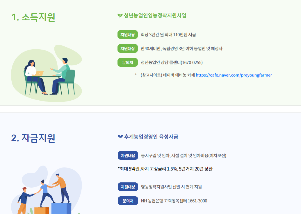 다행히, 203040이 안전하게 정착할 수 있도록 월 최대 110만원을 지급하고 있습니다. 아래 사진에서 볼 수 있듯이 소득지원 부문에 해당하고요, 최대 3년간 보장된다고 하네요. 농지구입, 임차, 시설 설치 비용에 관한 부분도 지원되고 있으니 꼼꼼히 살펴보시고 받을 수 있는 혜택은 다 받으시길 바랍니다.